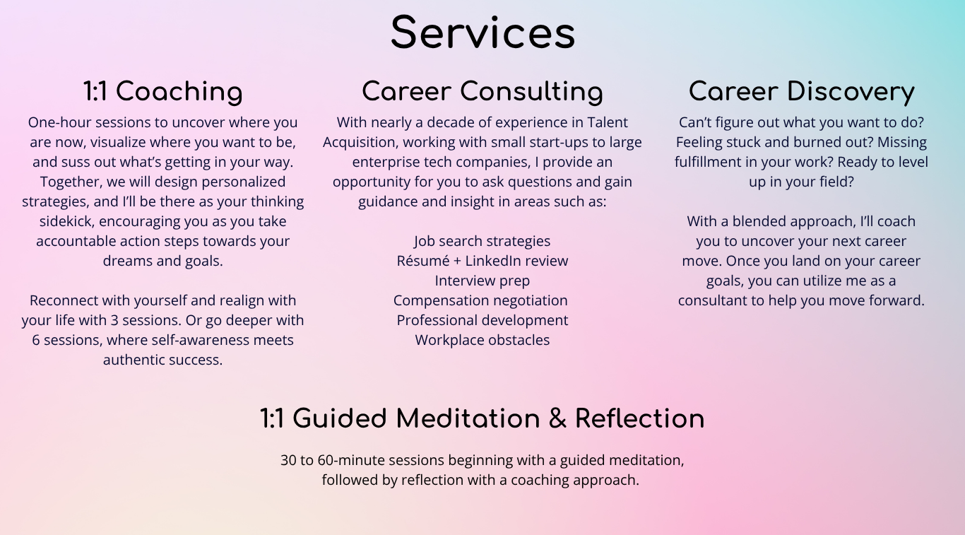 Everyone has different and unique challenges. To understand the best way to serve you, I take the time to get to know you. Let’s get started with a free Discovery Call!